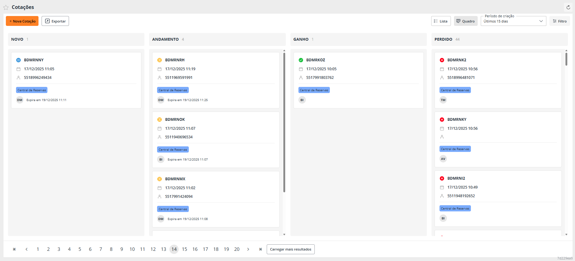 Agora, além da visualização tradicional em lista, os usuários contam com a visualização em 4 colunas no padrão Kanban, permitindo acompanhar toda a jornada das cotações de forma visual, intuitiva e orientada à conversão.